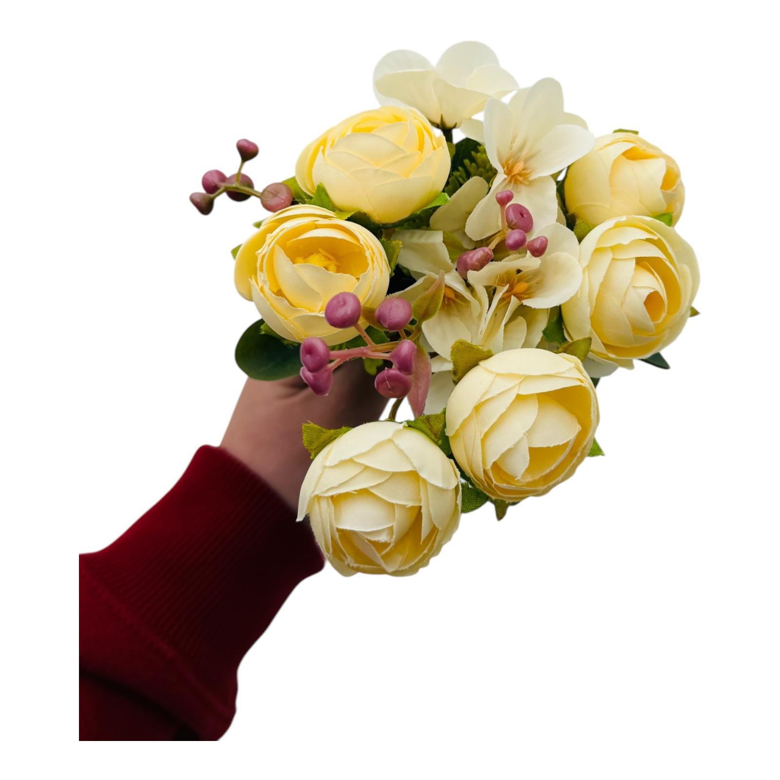 Buchetul artificial deosebit cu 6 bujori, 10 flori de camelie și bulbi este o expresie a rafinamentului și eleganței, ideal pentru a adăuga un plus de frumusețe oricărui spațiu. Fiecare element al acestui buchet este atent realizat pentru a imita naturalețea florilor proaspete, oferind un aspect autentic și o textură plăcută la atingere. Cu o înălțime de 29 cm și un singur fir care leagă armonios toate florile, acest buchet este perfect pentru aranjamente florale sofisticate, decoruri interioare sau evenimente speciale. Bujorii, simboluri ale prosperității și fericirii, sunt combinați cu florile delicate de camelie, cunoscute pentru eleganța și frumusețea lor atemporală, iar bulbul adaugă un element natural distinctiv. Acest buchet este potrivit atât pentru utilizare individuală, cât și ca parte a unor compoziții florale mai complexe, fiind o alegere ideală pentru decoruri de nuntă, recepții, vitrine comerciale sau amenajări interioare. Disponibil en-gros, acest buchet artificial combină durabilitatea cu estetica deosebită, oferindu-vă posibilitatea de a crea decoruri spectaculoase fără grija întreținerii florilor naturale. Este soluția perfectă pentru cei care își doresc frumusețea florilor, dar și practicitatea acestora.