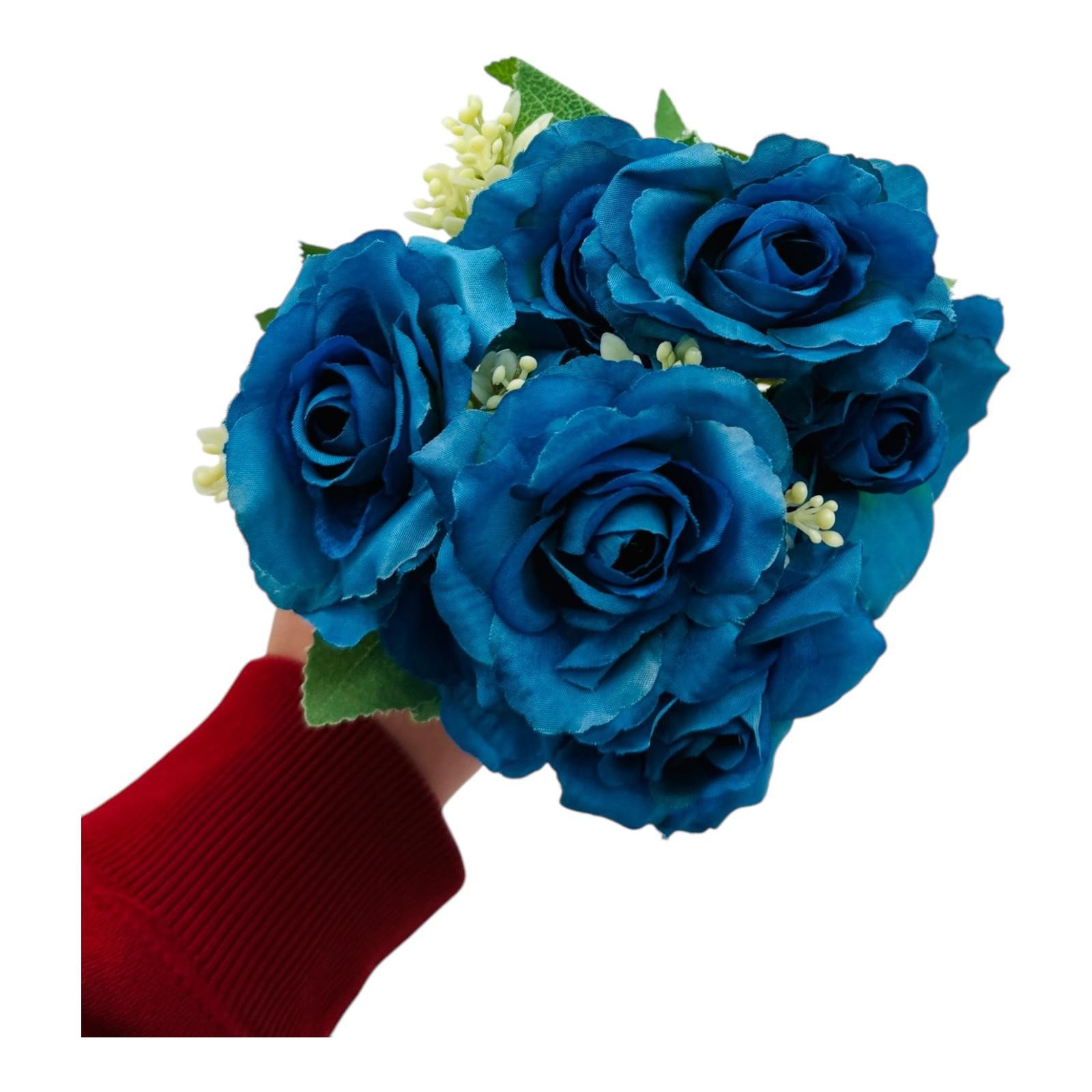 Buchet artificial deosebit cu 7 trandafiri si crengute de eucalipt cu boboci, un singur fir, 30cm, albastru regal, Engros