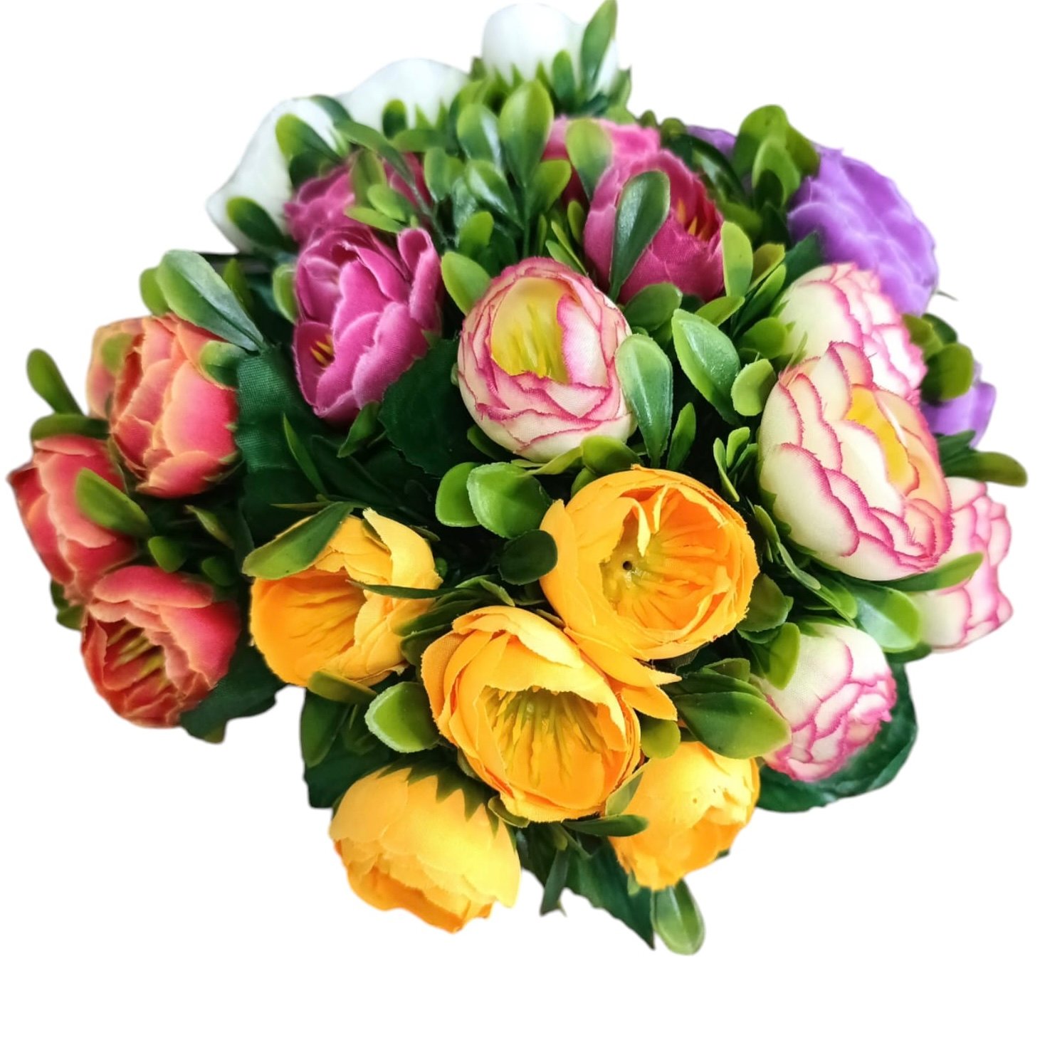 Adaugă o notă vibrantă decorului tău cu acest set de flori artificiale în culori vii și variate. Acest buchet este perfect pentru a înveseli orice spațiu, fie că este vorba de o masă, un birou sau o vitrină. • Culori Vibrante: Include o paletă bogată de nuanțe, de la roșu intens și galben solar până la albastru pastel și mov regal. • Realism Detaliat: Fiecare floare este concepută cu detalii minuțioase, oferind un aspect natural și autentic. • Ușor de Folosit: Buchetele pot fi utilizate individual sau combinate pentru aranjamente mai mari. • Durabilitate Excelentă: Materialele de înaltă calitate asigură păstrarea culorilor și formei pe termen lung. • Fără Întreținere: Bucură-te de frumusețea florilor fără grija udării sau a decolorării. Acest aranjament floral este alegerea ideală pentru a aduce prospețime și energie oricărui colț al casei sau biroului. Dimensiuni 22cm