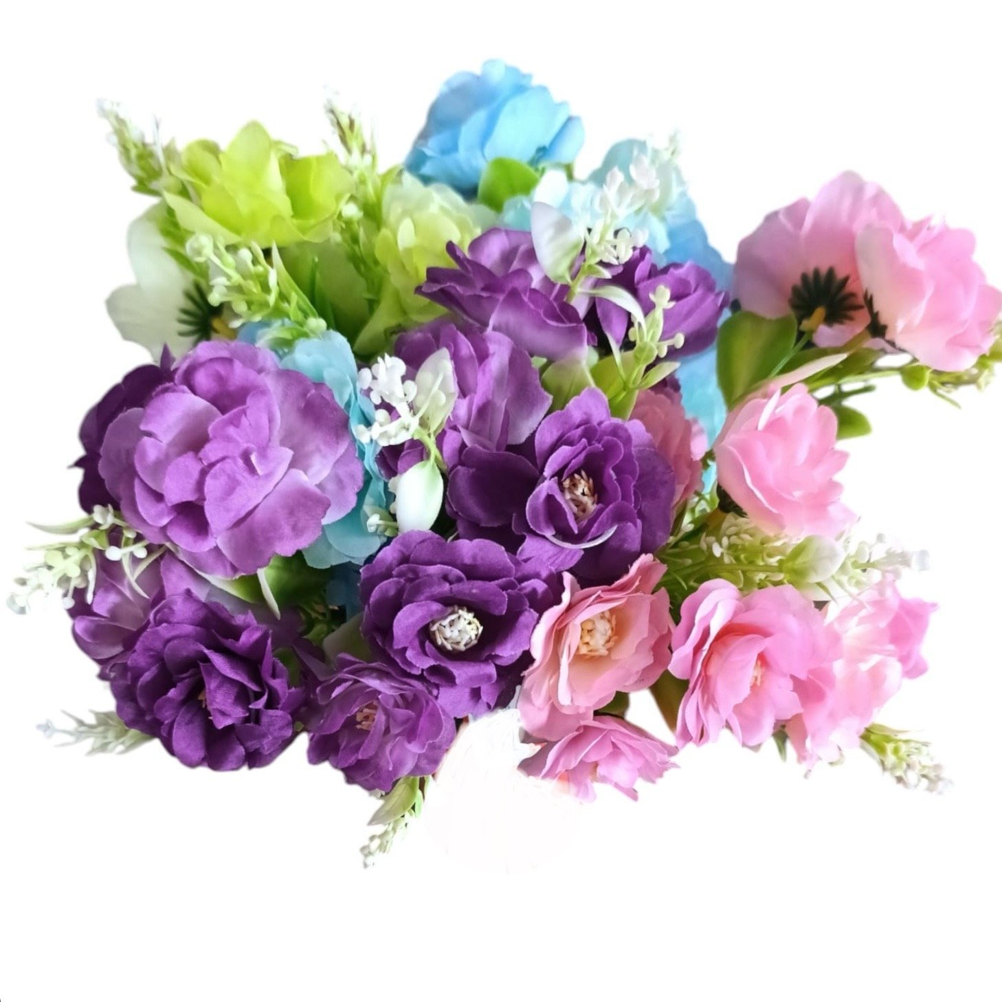 Adaugă o notă vibrantă decorului tău cu acest set de flori artificiale în culori vii și variate. Acest buchet este perfect pentru a înveseli orice spațiu, fie că este vorba de o masă, un birou sau o vitrină. • Culori Vibrante: Include o paletă bogată de nuanțe, de la roșu intens și galben solar până la albastru pastel și mov regal. • Realism Detaliat: Fiecare floare este concepută cu detalii minuțioase, oferind un aspect natural și autentic. • Ușor de Folosit: Buchetele pot fi utilizate individual sau combinate pentru aranjamente mai mari. • Durabilitate Excelentă: Materialele de înaltă calitate asigură păstrarea culorilor și formei pe termen lung. • Fără Întreținere: Bucură-te de frumusețea florilor fără grija udării sau a decolorării. Acest aranjament floral este alegerea ideală pentru a aduce prospețime și energie oricărui colț al casei sau biroului. Dimensiuni 35cm