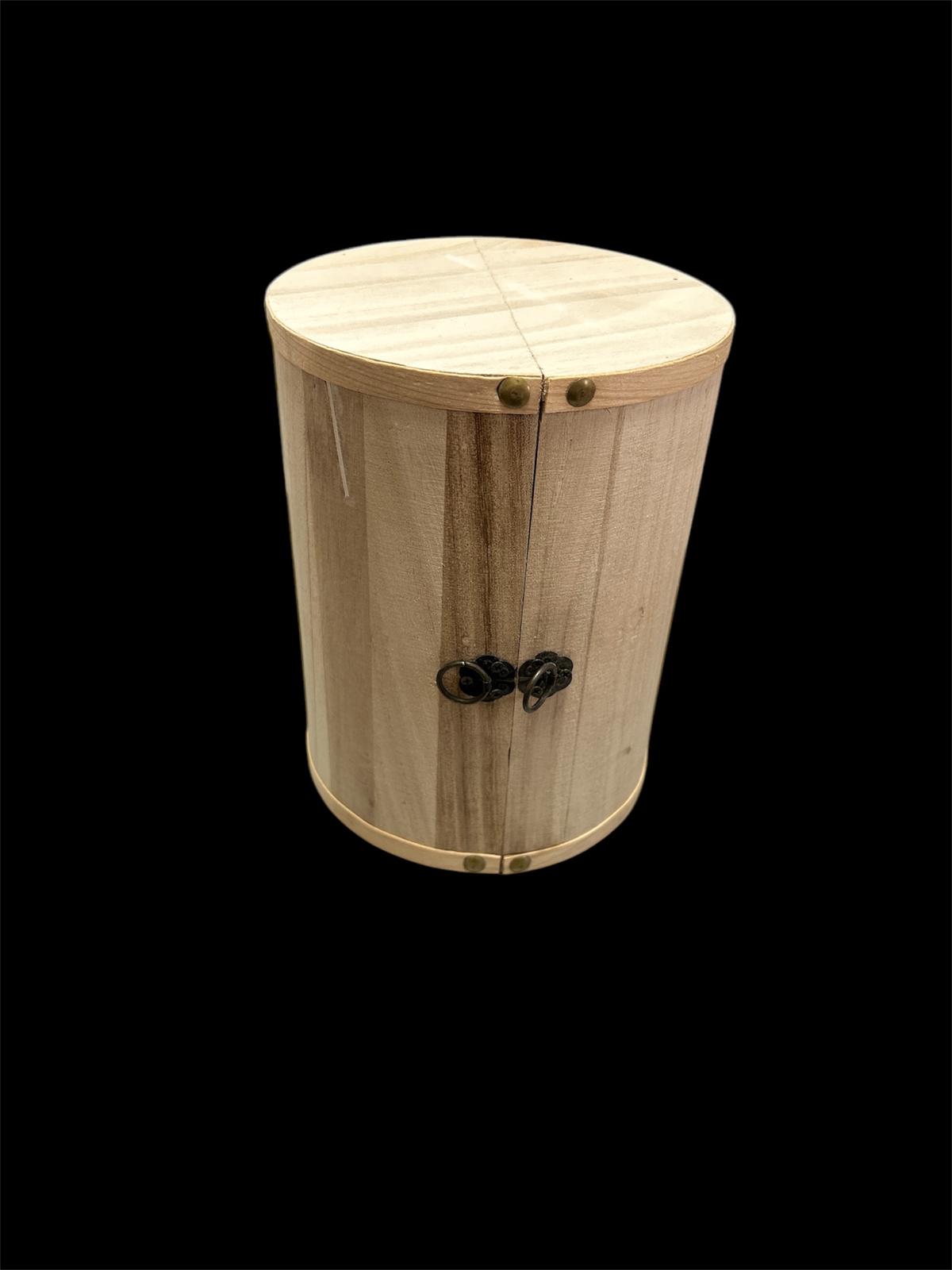Cutie lemn natur, forma cilindrica, cu inchidere tip magnet, dimensiuni: 20x15 (inchisa) si 20x30 (deschisa) material nefinisat ce permite lăcuire/vopsire/pictare/printare