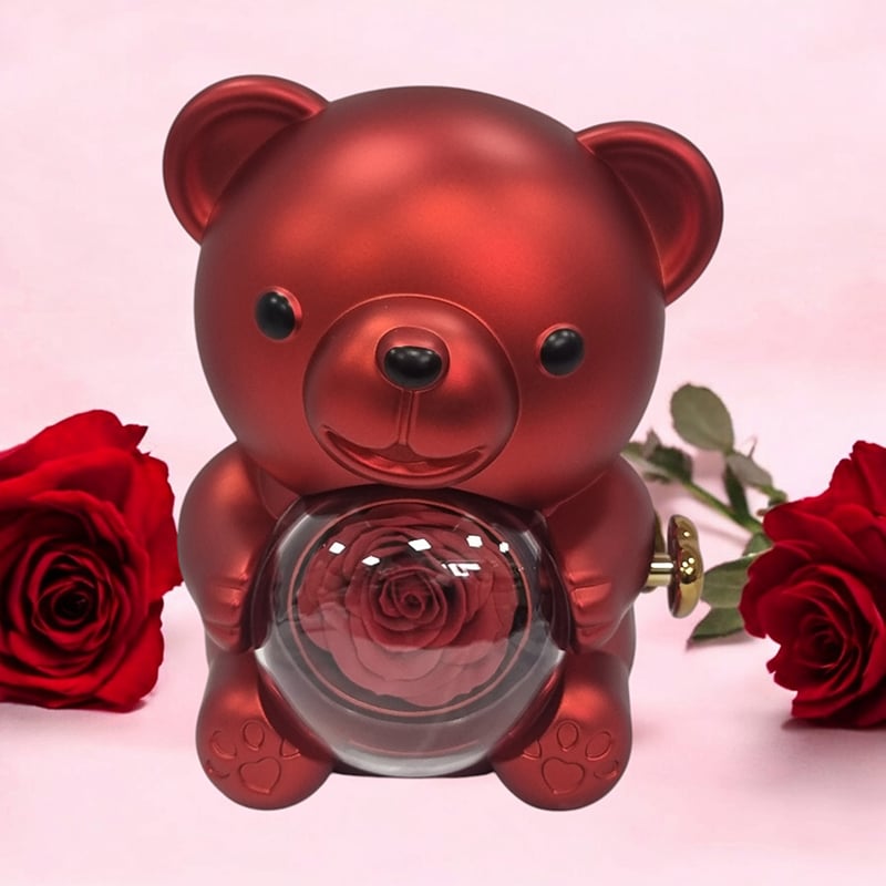Decoratiune Urs cu floare de sapun si casuta pentru bijuterii 8 cm inaltime