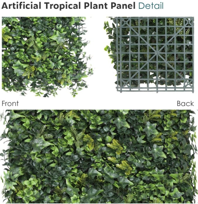 Dimensiune produs: L x H = 60x40 cm Sunt confectionate din material plastic de inalta calitate si durabil, cu protectie UV. Nu au miros si sunt rezistente la intemperii (ploaie, inghet). Panoul verde artificial poate fi folosit atat la interior cat si la exterior si anume: Pereti de fundal al spatiilor de locuit (hol, living, bucatarie, baie, dormitaore, etc.) Decor si protectie vizuala pentru terase, balcoane, curti interioare, pergole, verande, etc. Solutii arhitecturale pentru spatii comerciale, panouri publicitare, centre spa si infrumusetare, show-room-uri, studiouri, hoteluri, restaurante, birouri etc.Amenajari decor de nunta si evenimente artistice