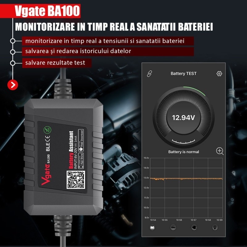 Produsul poate prezenta urme minime de utilizare, lipsa folii protectie, zgarieturi fine, lipsa cutia originala sau usor deteriorata, lipsa accesorii Modulul pentru monitorizare a bateriei auto Vgate BA100 permite monitorizarea in timp real a performantelor acumulatorului de 12V al autoturismului. Se instaleaza o aplicatie pe telefonul mobil care se conecteaza prin Bluetooth 4.0 si permite vizualizarea informatiilor monitorizate. Modulul permite si stocarea informatiilor in memoria sa, apoi la conectarea cu telefonul mobil (sau tableta) informatiile din trecut se descarca si pot fi vizualizate in aplicatie. Se stocheaza pana la 31 zile in memorie. Informatiile stocate pot fi vizualizate in grafice. Aceasta monitorizare este importanta pentru toate autovehiculele, dar in special ajuta masinile electrice si/sau hibrid pentru ca la aceste autovehicule nu exista semnale externe atunci cand acumulatorul de 12V este pe cale de a se defecta (fata de masinile clasice unde iti mai poti da seama la pronirea motorului). La masinile electrice/hibrid acumulatorul de 12V trebuie doar sa alimenteze calculatoarele masinii si sa cupleze contactorul principal al bateriei HV (de voltaj ridicat, de tractiune). Specificatii : conexiune Bluetooth 4.0 compabitil cu minim Android 4.3 si IOS minim 7.1 numele aplicatiei: Battery Asst compatibil cu toti acumulatorii auto de 12V date stocate in modul timp de 31 zile Continut pachet: modul monitorizare Bluetooth 4.0 manual utilizare