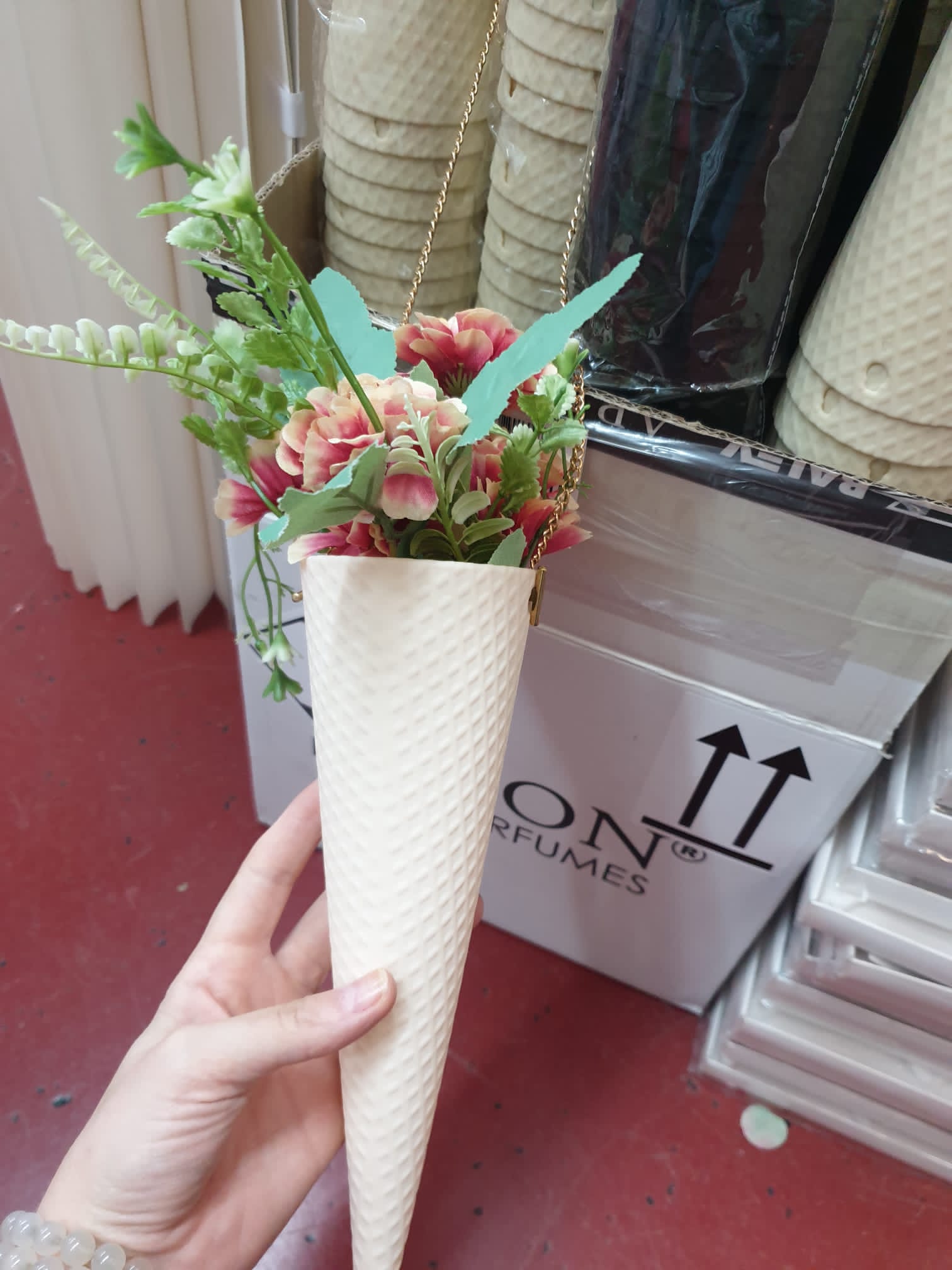 Suport cornet pentru flori , engros cu lănțișor - dimensiune cornet: 27 cm -are lănțișor pentru agățat -material plastic