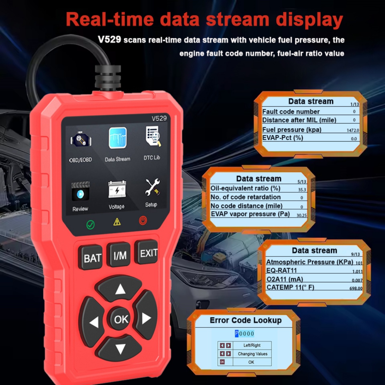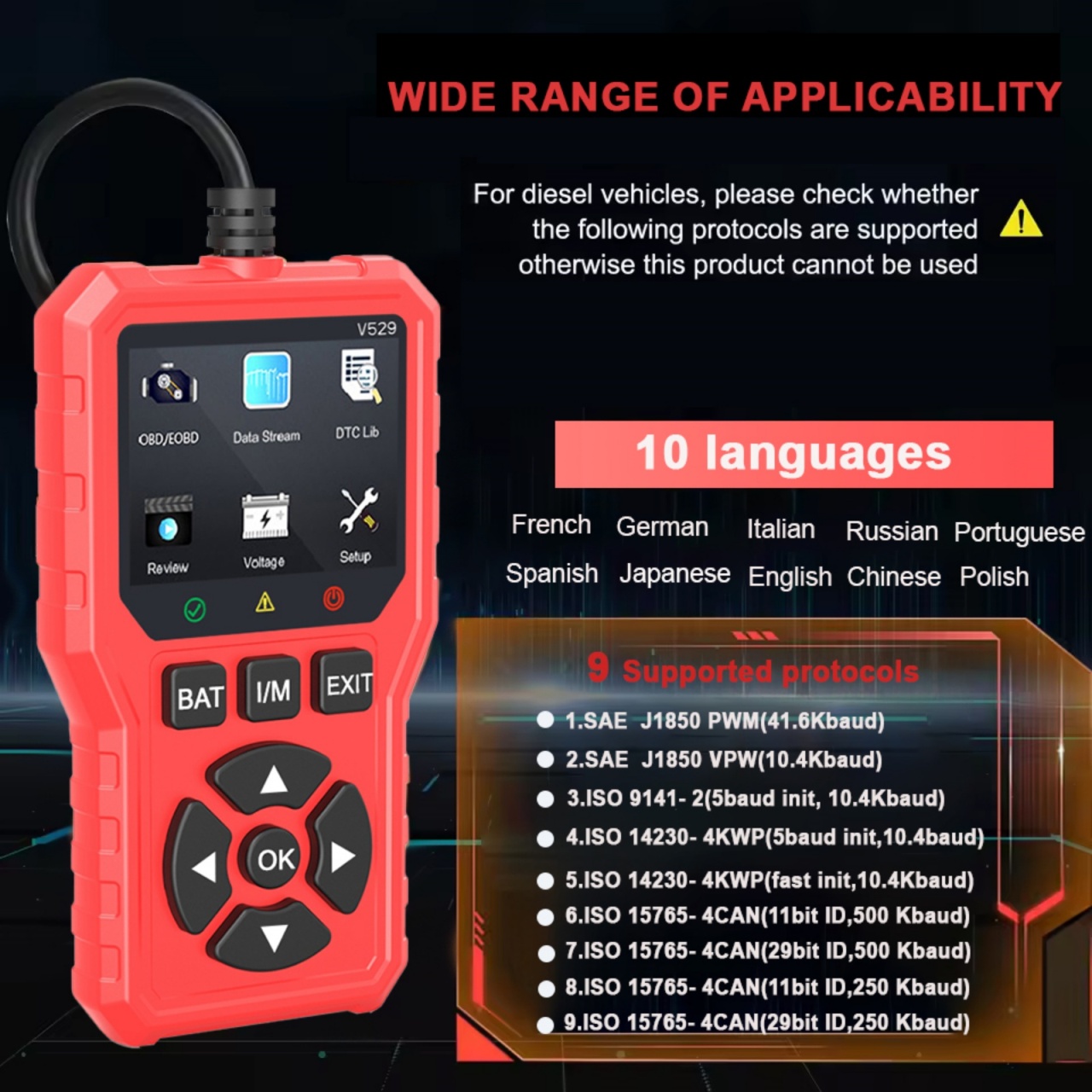 Tester auto diagnoza Foxsur V529 OBD2, testare baterie, DTC Lookup, I/M Readiness, Freeze Frame, EVAP, O2 Sensor, coduri motor ? Diagnoza completa + test baterie = instrument 2-in-1 esential pentru orice sofer sau mecanic! Foxsur V529 este un dispozitiv profesional de diagnoza auto compatibil cu toate vehiculele echipate cu mufa OBD2 (16 pini), fabricate dupa anul 1996 (benzina) si 2000 (diesel). Acesta ofera o gama extinsa de functii pentru identificarea, interpretarea si stergerea codurilor de eroare, testarea componentelor electronice si evaluarea sanatatii bateriei. ✅ Functii principale: Citire si stergere coduri eroare motor (DTC) Interpretare coduri eroare cu functia DTC Lookup (consultare cod fara internet) Afisare flux de date in timp real (Live Data Stream) Vizualizare Freeze Frame (date salvate la aparitia unei erori) Testare senzor O2 (oxigen) Testare sistem EVAP Moduri avansate: Mode 6 , Mode 8 , I/M Readiness Testare tensiune baterie in timp real (BAT) Verificare stari monitoare OBD Suporta 35.000+ coduri de eroare , inclusiv coduri specifice producatorilor Functie Review pentru vizualizarea istoricului testelor 10 limbi disponibile , inclusiv engleza, franceza, spaniola, germana, italiana, portugheza, rusa, poloneza, chineza, japoneza Update prin USB ?️ Ecran color si navigare intuitiva: Display TFT color de aproximativ 2.4 inch Butoane dedicate: OK, navigare, ESC, BAT, I/M, EXIT Interfata prietenoasa, afisaj clar si structurat ? Compatibilitate larga: Suporta toate cele 9 protocoale OBD2: SAE J1850 PWM (41.6Kbaud) SAE J1850 VPW (10.4Kbaud) ISO 9141-2 ISO 14230-4 KWP ISO 15765-4 CAN (11bit & 29bit, 250K/500K baud) ? Continut pachet: Tester diagnoza Foxsur V529 Cablu OBDII integrat Manual de utilizare Cutie de prezentare ⚙️ Specificatii tehnice: Alimentare: direct din portul OBDII al masinii (8-18V) Nu necesita baterii externe Nu necesita aplicatii sau conexiune internet Greutate: aproximativ 350g Dimensiuni: 15 x 8 x 2.5 cm ? Atentie : Nu functioneaza pe vehicule care nu sunt conforme cu standardul OBD2 (ex. unele modele Lada, UAZ, Renault inainte de 2004 etc.)