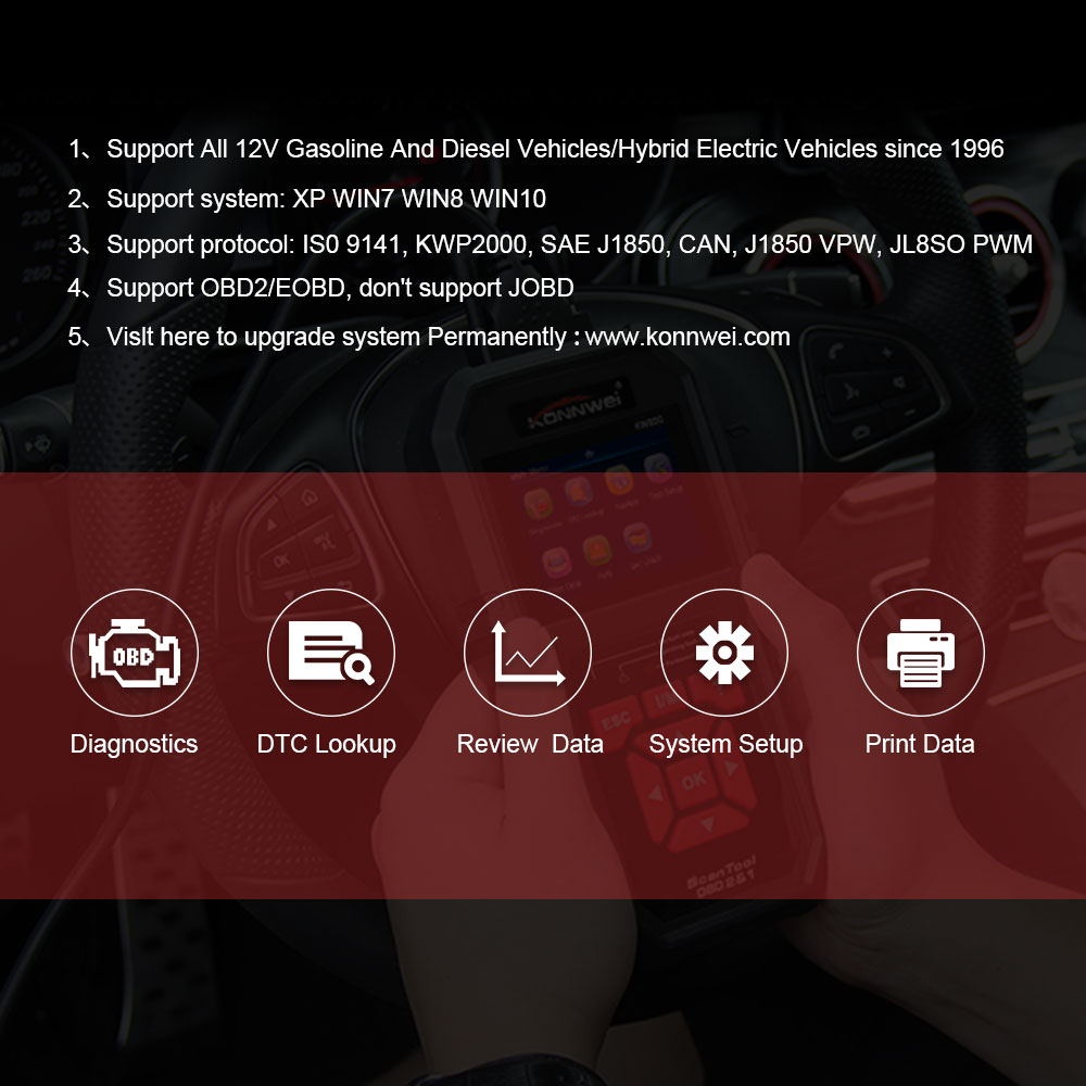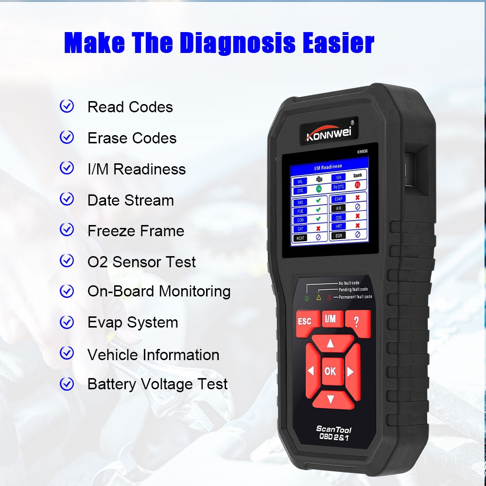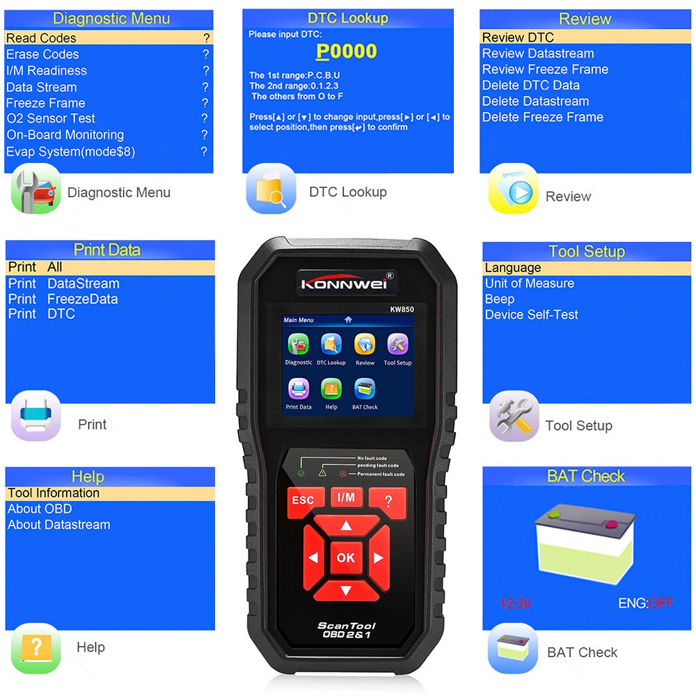 Tester auto OBD2 Konnwei KW850 – Diagnoza completa motor si test baterie 12V ? Echipament profesional pentru citirea si stergerea codurilor de eroare de motor (DTC), testarea senzorilor si evaluarea sanatatii bateriei. Dispozitivul Konnwei KW850 este compatibil cu majoritatea masinilor cu OBD2/EOBD fabricate dupa 1996 si este dotat cu ecran color TFT de 2.8 si functii avansate pentru utilizatori casnici si service-uri. ? Functii principale: ✔️ Citeste si sterge coduri eroare motor (DTC) ✔️ Afiseaza date in timp real (live data stream) ✔️ Test EVAP, senzor O2, sistem EGR ✔️ Citeste informatii vehicul (VIN, CIN, CVN) ✔️ Afiseaza cadre de inghet (Freeze Frame) ✔️ Verifica pregatirea I/M (emisii) ✔️ Test tensiune baterie si stare pornire ✔️ Cautare coduri DTC + explicatii ✔️ Tiparire raport diagnostic prin PC (USB) ✔️ Actualizare software gratuita pe viata ✔️ Suporta peste 10 limbi (EN, DE, FR, ES, IT, PT, RU, etc.) ✔️ Lumina LED si semnal sonor pentru confirmare status diagnoza ✔️ Buton rapid I/M Ready pentru verificare emisii ⚙️ Specificatii tehnice: Ecran: TFT color 2.8 Rezolutie ecran: 320x240 Tensiune operare: 8–18V (alimentare prin mufa OBD) Temperatura functionare: 0°C ~ +60°C Temperatura depozitare: -20°C ~ +70°C Suporta protocoale: ISO9141, KWP2000, SAE J1850, CAN Dimensiuni: 195 x 100 x 35 mm Greutate: 600 g Suporta masini pe benzina/diesel/hibrid cu priza OBDII 16 pini ? Pachetul include: Tester Konnwei KW850 Cablu OBD2 Cablu USB pentru update si print Husa de protectie Manual utilizare (EN) ⚠️ Atentie: ✅ Compatibil doar cu masini cu priza OBD2 (modele fabricate dupa 1996). ❌ Nu functioneaza pe masini J1850PWM/JOBD sau modele rusesti (VAZ, LADA) fabricate inainte de 2012.
