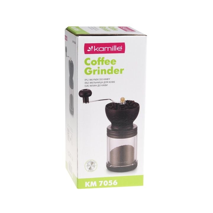 Rasnita Engros manuala pentru cafea si condimente, Kamille, din Plastic / Sticla, Maner detasabil, Capacitate 220 g, Transparent / Negru