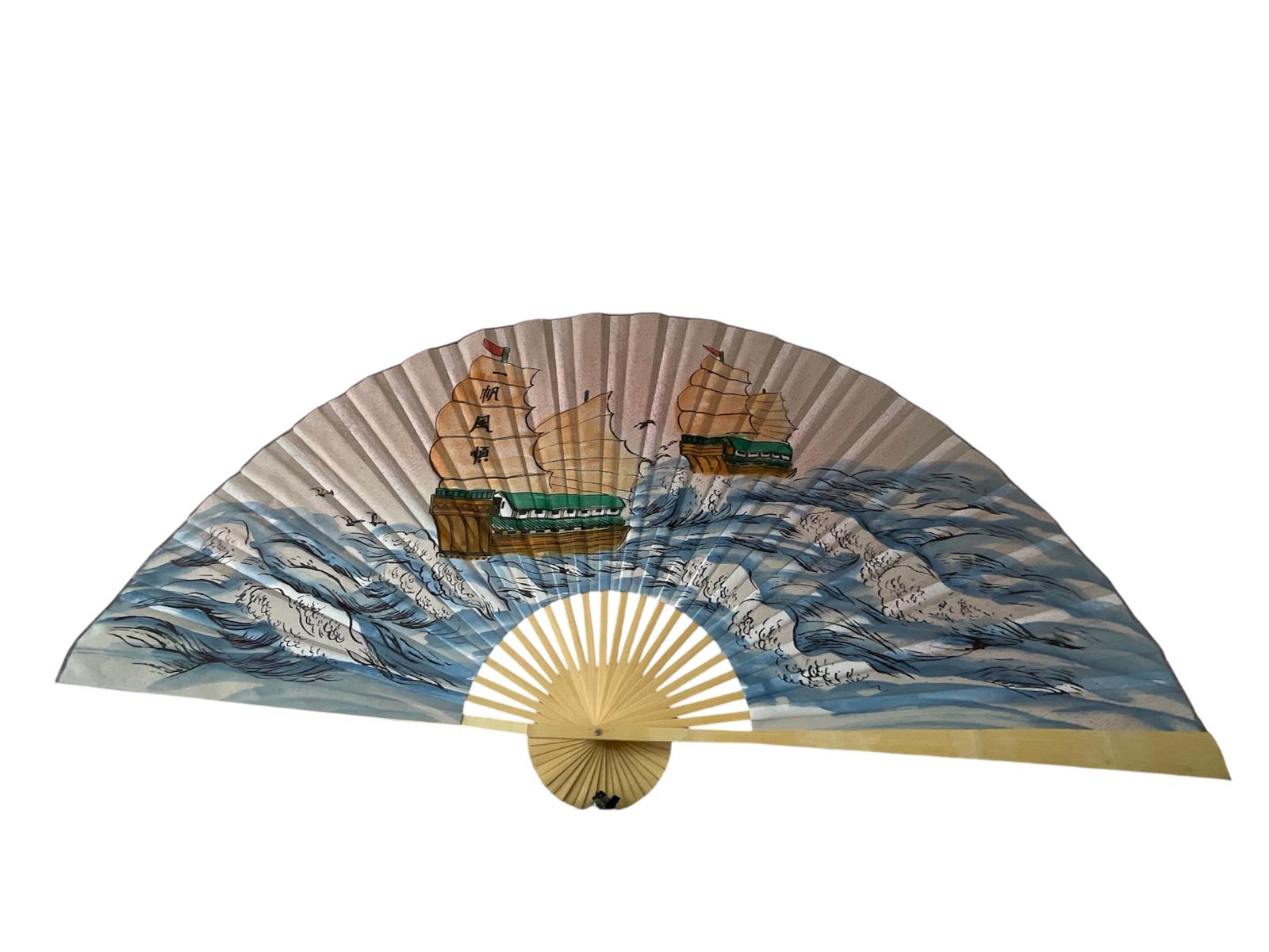 Evantai de perete din lemn, Roz cu corabii pe mare, dimensiuni: 90 cm