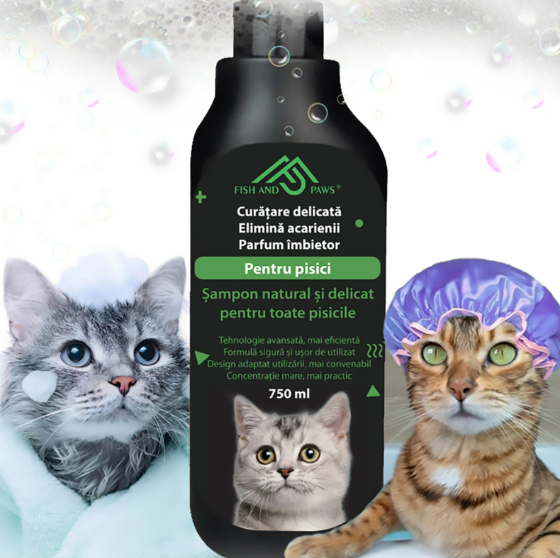 Sampon pentru pisici Fish & Paws ® pentru o blana pufoasa si sanatoasa, curatare delicata, hidrateaza parul, elimina acarienii