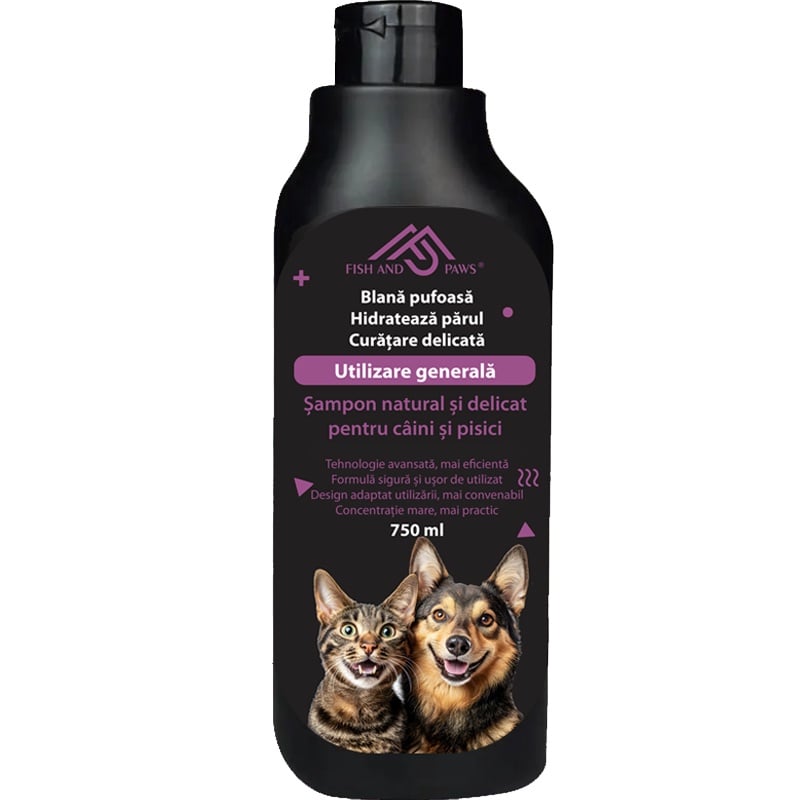Sampon pentru caini si pisici Fish & Paws ®, utilizare generala, pentru o blana pufoasa si sanatoasa, curatare delicata, hidrateaza parul 750 ml.