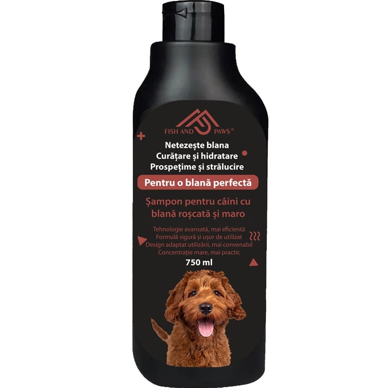 Sampon pentru caini Fish & Paws ® cu blana roscata sau maro, asigura o blana pufoasa si sanatoasa, oferindu-i prospetime si stralucire, formula sigura, usor de folosit