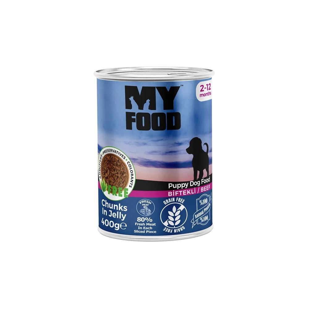 Hrană umedă pentru câine junior, MyFood, cu bucăți de vită în sos, 400 g, super premium, dezvoltare sănătoasă, energie pentru joacă, masă musculară Engros