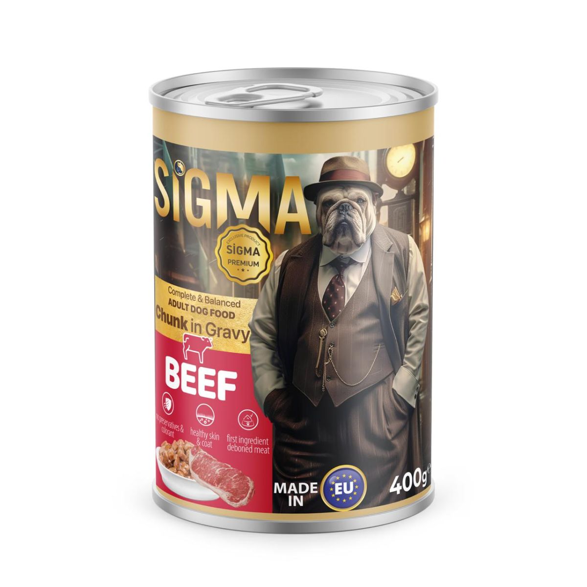 Hrană umedă pentru câini adulți, Sigma, cu carne de vită, conservă 400 g, premium, gust intens cu carne de vită, digestie sănătoasă, energie zilnică Engros