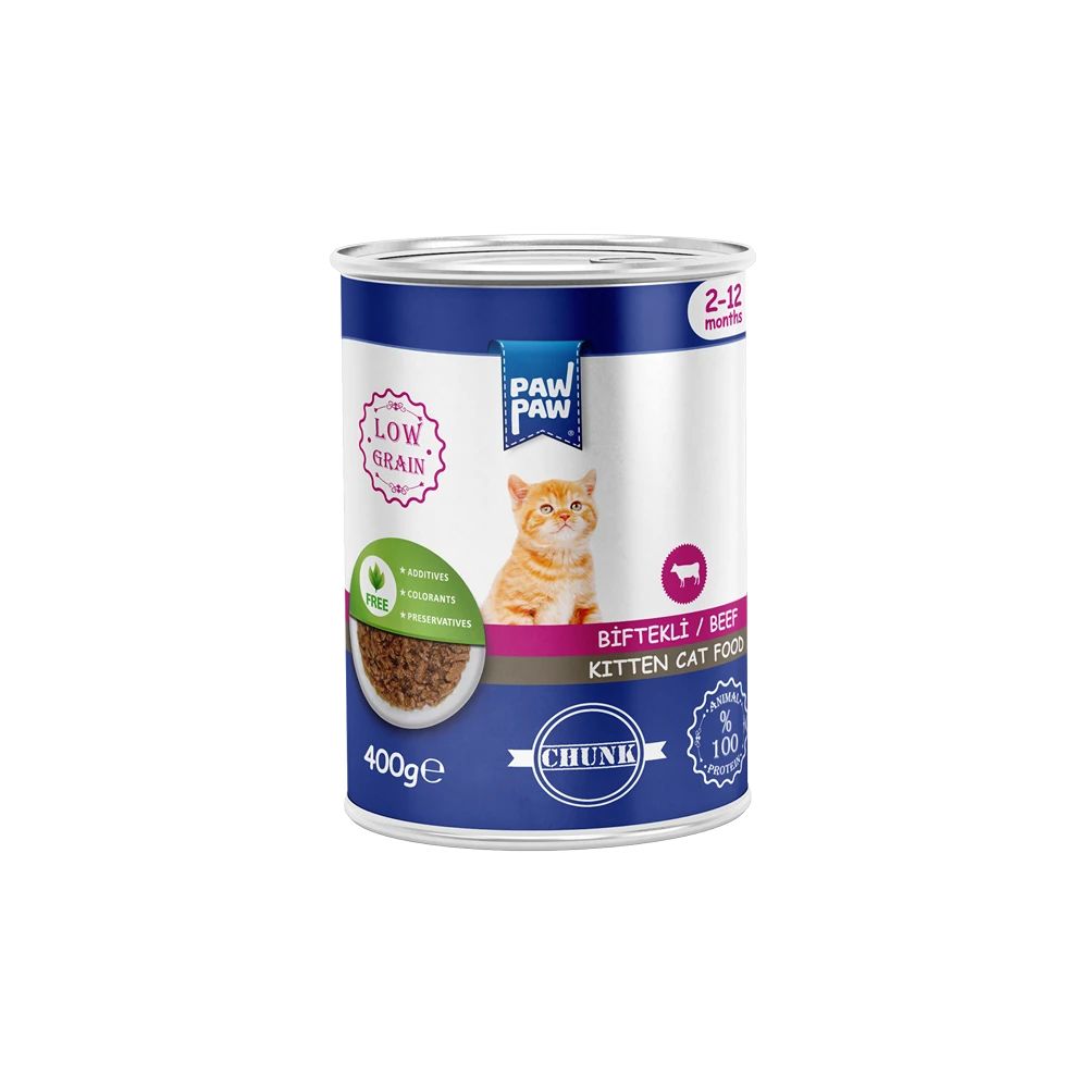 Hrană umedă pentru pisică junior, PAWPAW, bucăți de vită în sos, 400 g, premium, conținut redus de cereale, 100% proteină animală, digestie ușoară, vitalitate și creștere sănătoasă Engros