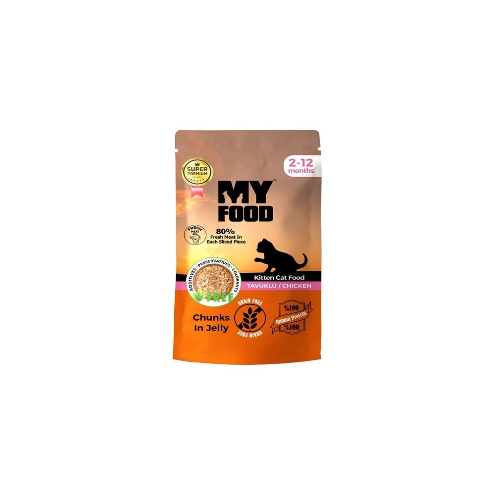 Hrană umedă pentru pisici junior, fără cereale, MyFood, cu bucăți de pui în sos, 85 g, super premium, proteine de calitate, digestie ușoară și gust delicios Engros