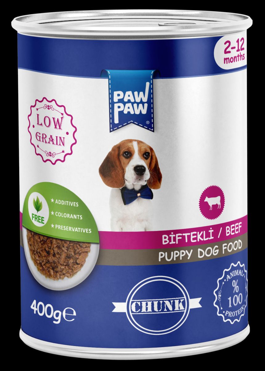 Hrană umedă pentru câine junior, PAWPAW, bucăți de vită în sos, 400 g, conținut scăzut de cereale, premium, conținut redus de cereale, 100% proteină animală, digestie ușoară și creștere sănătoasă Engros