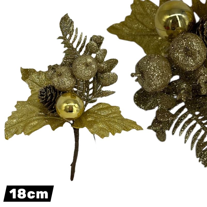 Crenguță de Crăciun cu sclipici 18 cm cu mere, jucărie de Crăciun și conuri, auriu– en-gros