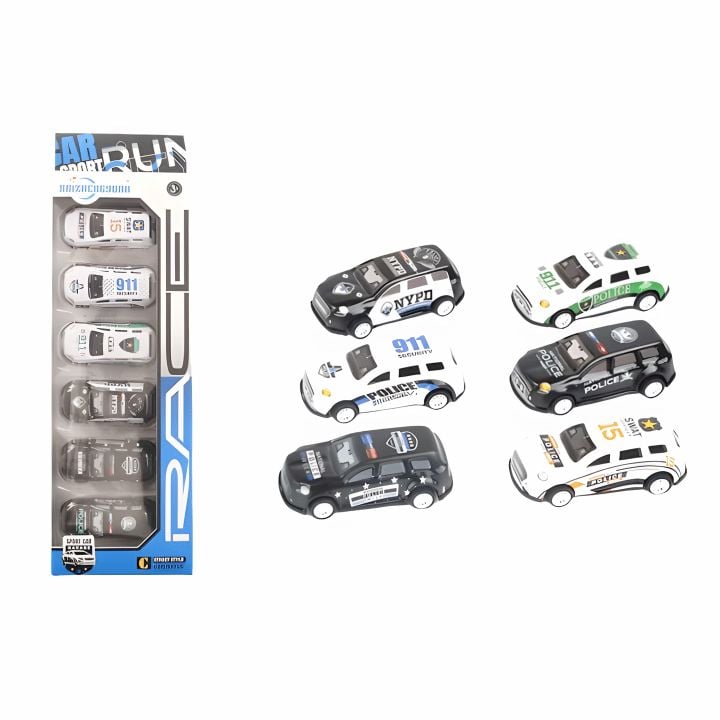 Set 6 Masinute Metalice Tip Politie, Culoare Negru-Alb, Pull-Back, Jucarii pentru Copii 3+ Engros