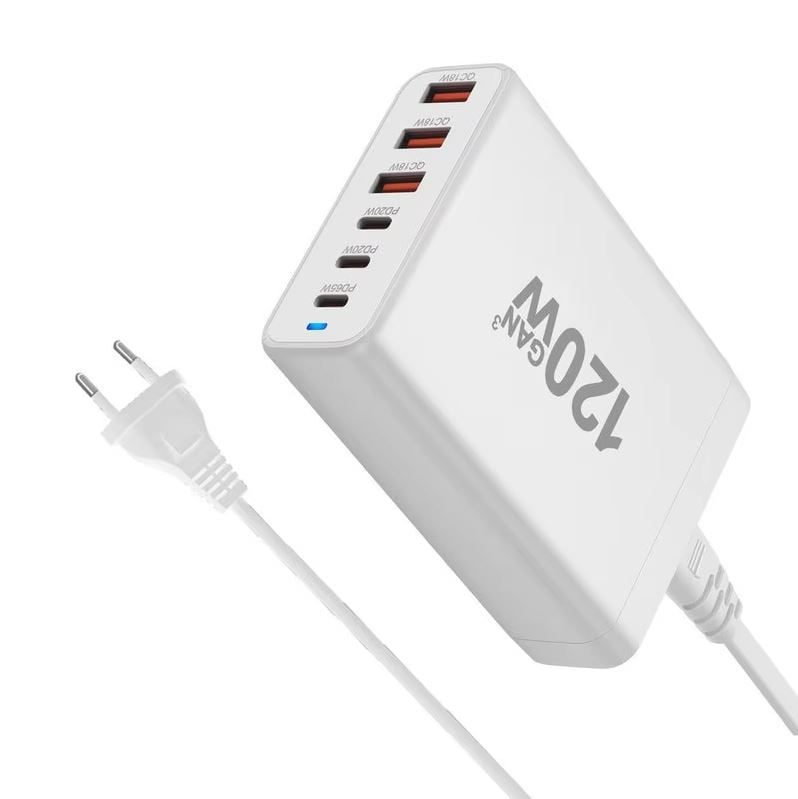 Statie Alimentare G-B36 cu 6 Porturi, 120W, USB + Type-C, Adaptor + Cablu pentru Priza EU, Alb Engros