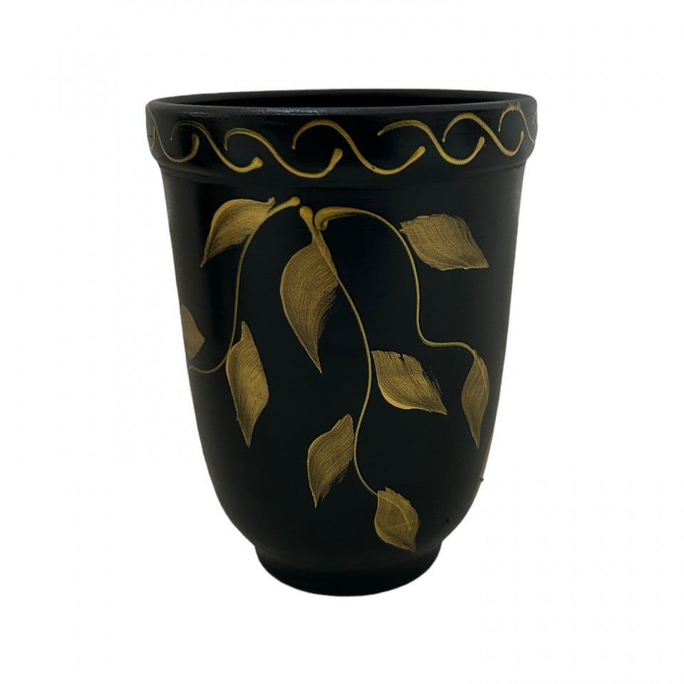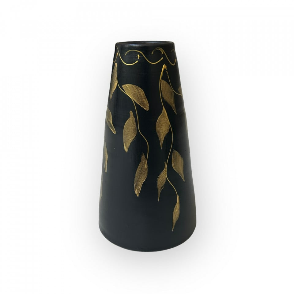 Vaza neagra engros din ceramica, pictata cu frunze aurii